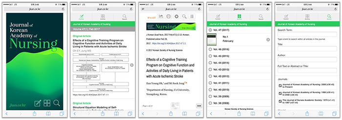 Journal of Korean Academy of Nursing의 e-journal platform이 새로운 기능과 새로운 모습으로 구축되었습니다 (그림 1). 또한 Mobile Web도 제공되고 있습니다 (그림 2). 주요 기능은 아래와 같습니다. 많은 이용 바랍니다.New Features: