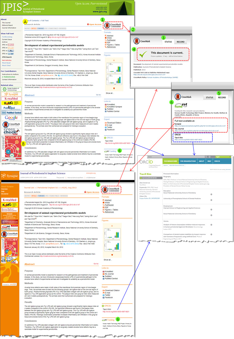 그림 1. Journal of Periodontal & Implant Science에 적용된 CrossMark 화면 (Synapse와 학술지 웹사이트에 동시 적용)