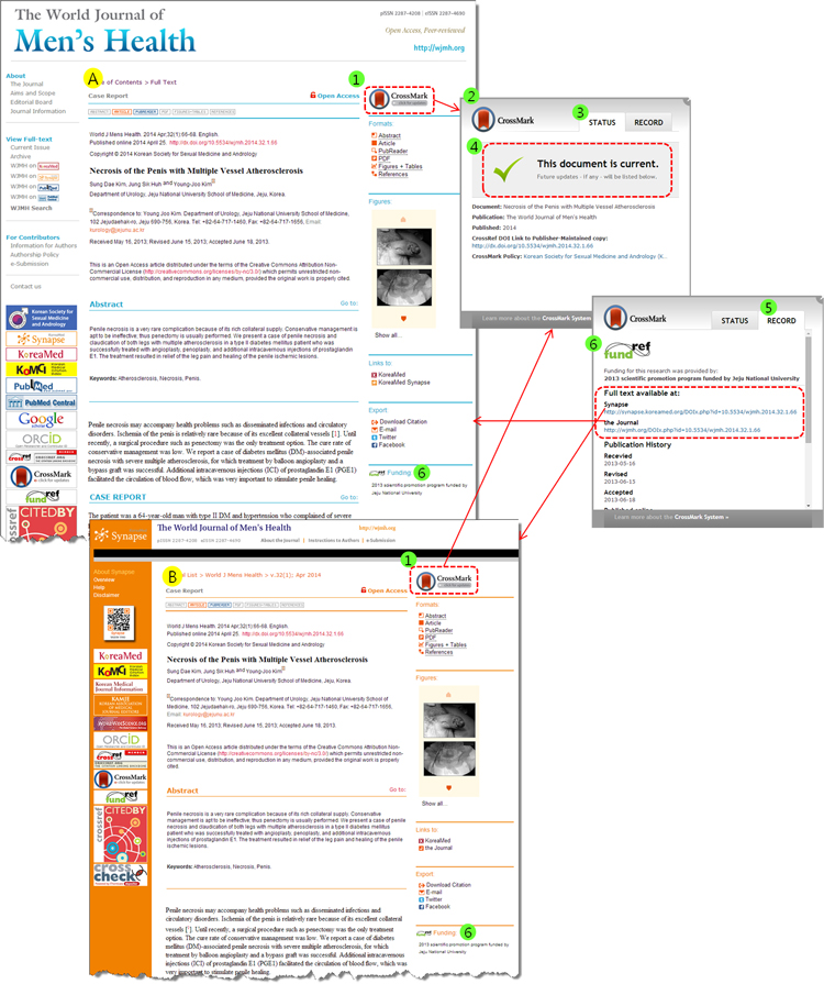 그림 1. The World Journal of Men's Health에 적용된 CrossMark 화면 (Synapse와 학술지 웹사이트에 동시 적용)